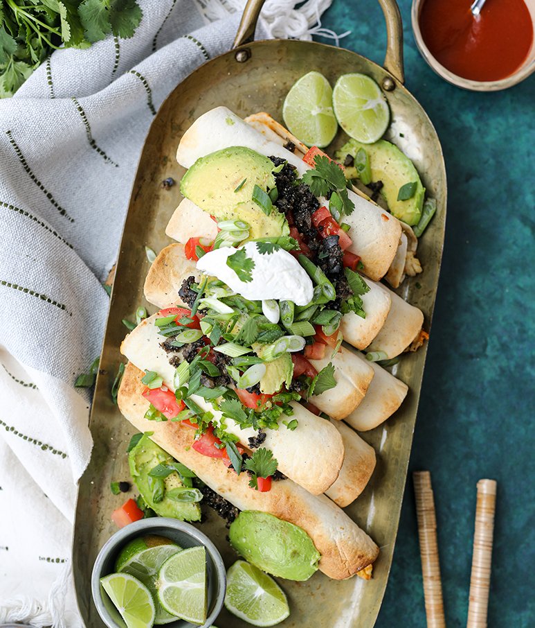 Add one row of the rolled taquitos into the air fryer basket, don’t overlap. Spray them with olive oil spray and cook them for 5 minutes at 400. Turn them over and cook for 1 additional minute. Work in batches if your air fryer is smaller. Once they are all cooked, you can top them with diced tomatoes, diced jalapeno, sliced scallions, and lime wedges.