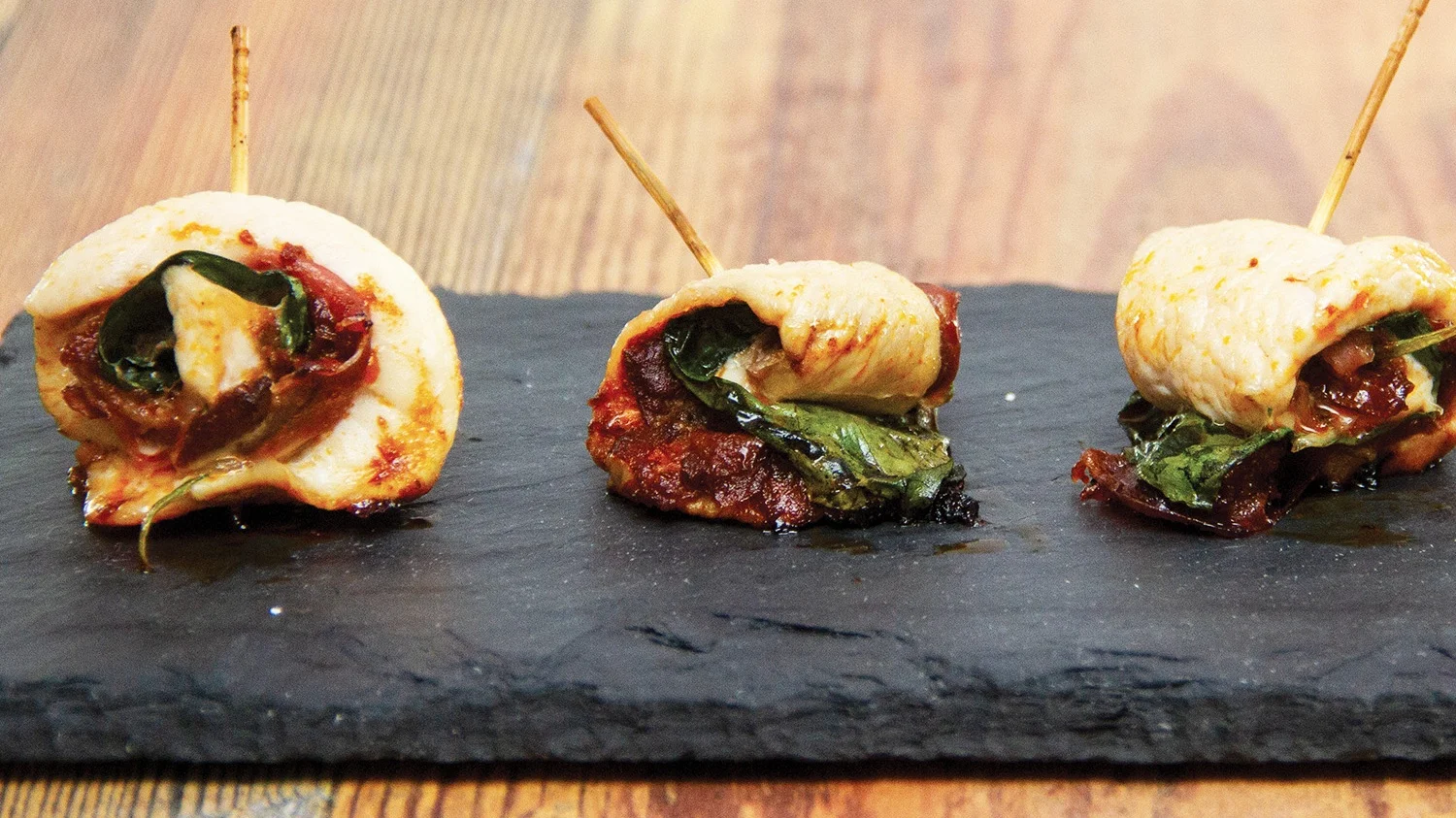 Bake the rollinis in the oven until the chicken reaches 165˚F, about 15 minutes. Drizzle rollinis with balsamic glaze and serve immediately.