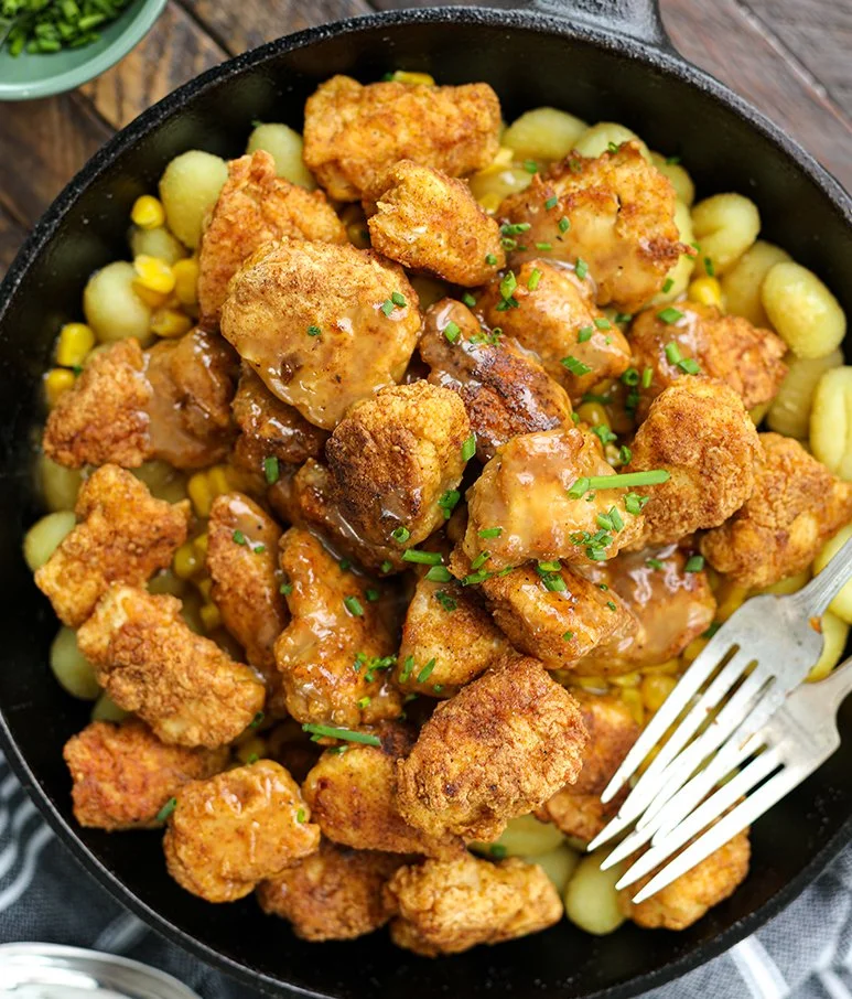 These crispy chicken bowls are comfort food at its finest. Layers of fluffy potato gnocchi, whole kernel corn, crispy fried chicken and delicious home style gravy. This is one of those recipes that the entire family will love. Perfect any night of the week, this recipe is totally satisfying and delicious.