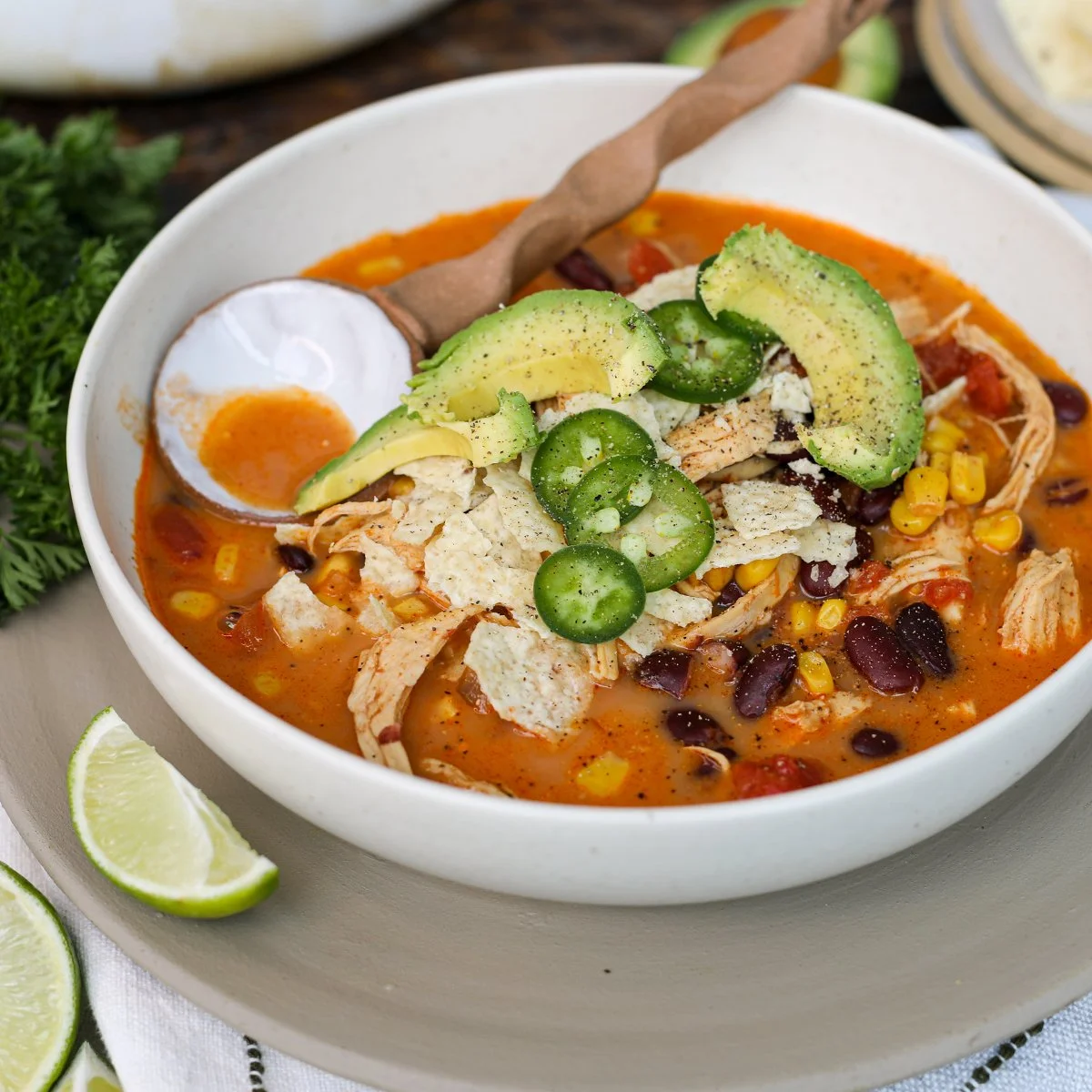 This Healthy White Lasagna Soup with Chicken will fill you up without slowing you down. It’s so good you won’t even miss the heavy cream, butter or flour! Thickened with cauliflower puree, this easy soup recipe is a great way to sneak extra veggies into your family’s diet too.