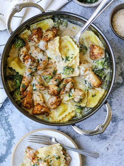 Spicy, creamy and easy to make, this one pan blackened chicken pasta bake is a weeknight win. The chicken tenderloins are cubed and dusted in my almost famous blackening spice. Pan seared then tossed with cheese ravioli, tender broccoli florets and the most delicious creamy Alfredo style sauce, your entire family will love this recipe.