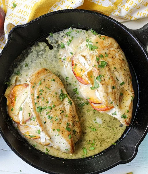 Pan roasted in a well-seasoned cast iron pan, the chicken is perfectly seared on the outside then baked to perfection in the oven. The ripe peaches, creamy brie and juicy chicken form the MOST delicious pan sauce that can be drizzled over the dish once it’s finished baking.